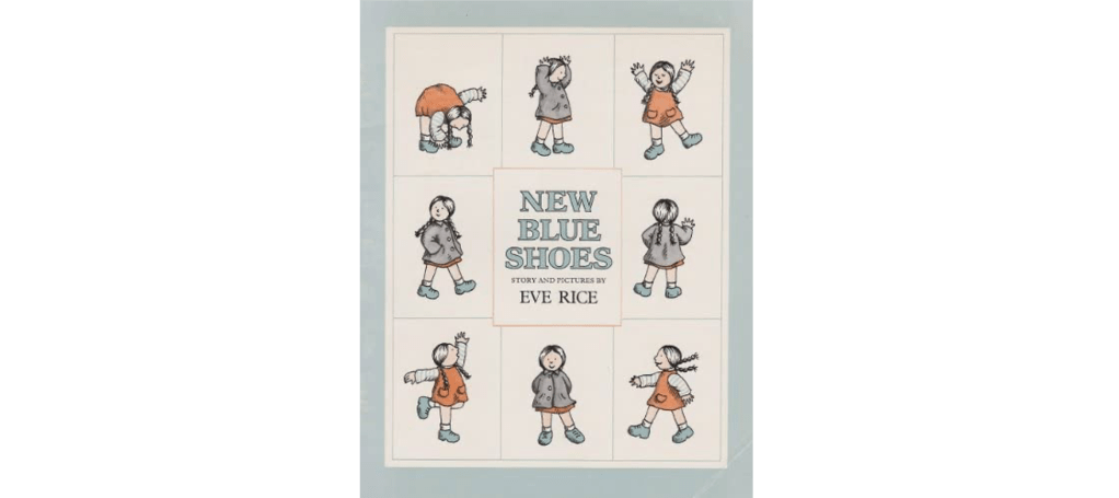 New Blue Shoes by Eve Rice! Like me, the heroine is named Rebecca and has strong feelings about shoes, so I related to her a lot. I just reread it, too, and it’s still such a pleasant little book. I love seeing all the different labels on the boxes in the store — like “Fabulous Feet” and “Goody Two Shoes”!